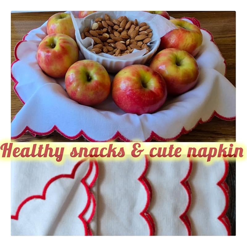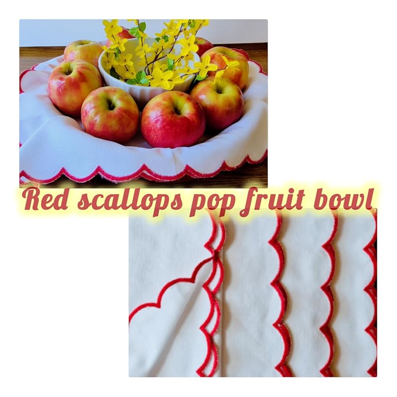 Blue Needle’s unique, finely stitched, scalloped-edged napkins fit my seasonal themes, making them both practical and decorative. Their scalloped style is among my favorites for holiday accent decorations and home dĂ©cor, including Valentine’s Day and other special occasions. The way they add a pop of color to my table settings always inspires me for my next home dĂ©cor project.HOME DÉCOR AND PRACTICAL USESThe Blue Needle’s red scalloped borders are both unique and attractive, yet also practical as bread, fruit, snack, and basket liners. For example, my photos show two table settings, one with a decorative flower snack basket and the other with a fruit and nut bowl. I’ve also successfully cleaned a few light stains with Shout Wipes and dried the napkins.WHITE CLOTH NAPKIN PROS AND CONSPROSCrisp, fresh appearanceCotton fabric is absorbent with a soft drapeColorful fruit pops with bright red napkin scalloped bordersScalloped edges are finely stitched and colorfulCONSCleaning white fabric requires extra attentionWhite fabric easily stains with food, oil, spices, and wine100 % cotton wrinkles easier than cotton fabric blendsNapkins are (17 x 17) slightly smaller than advertised (18 x 18)CONCLUSIONSFor a ‘fresh napkin look’ without an endless clean-up chore, these red scalloped napkins used for basket liners are my top choice. They serve as both decorative table accents and practical tableware, featuring cotton fabric and laundry care instructions for added convenience. I’m always delighted when unique napkin styles and patterns like these make a significant impact in my home; for these reasons, my rating is five stars.