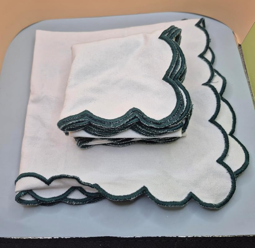 These cloth napkins are a lovely addition to my dining setup! The cotton fabric is soft, durable, and washable, making them great for everyday use or special occasions. The scalloped embroidery around the edges adds a subtle but elegant detail that enhances their look without being too flashy. The size is just right—not too small or large—and they fold nicely for storage. I appreciate that they are reusable, which helps cut down on waste compared to paper napkins. The white base with green edging gives a fresh and spring-like vibe to my table, perfect for seasonal decor. They’ve held up well through multiple washes without losing shape or color. Overall, they blend practicality and style beautifully, and I’m very pleased with how they elevate my dining experience.